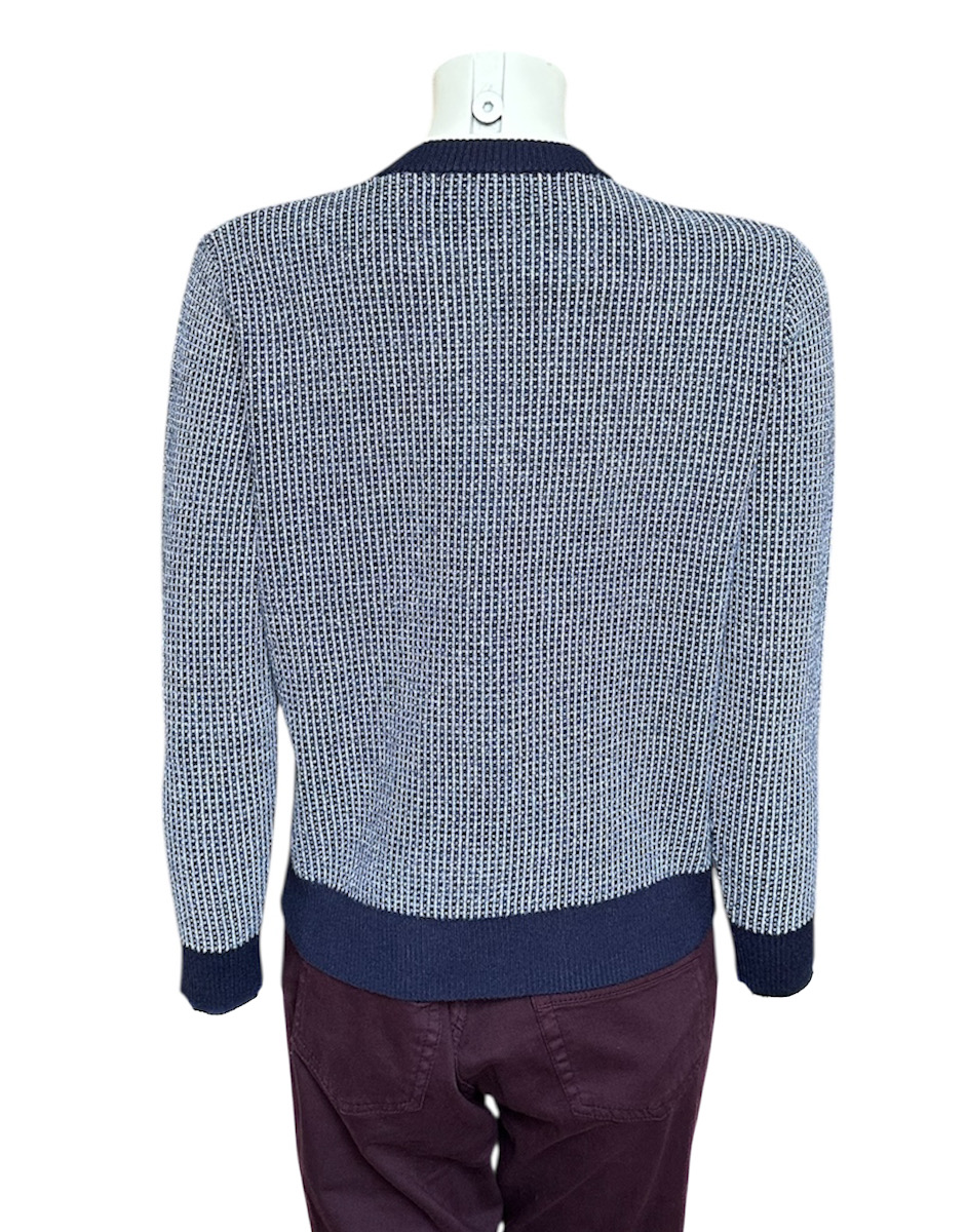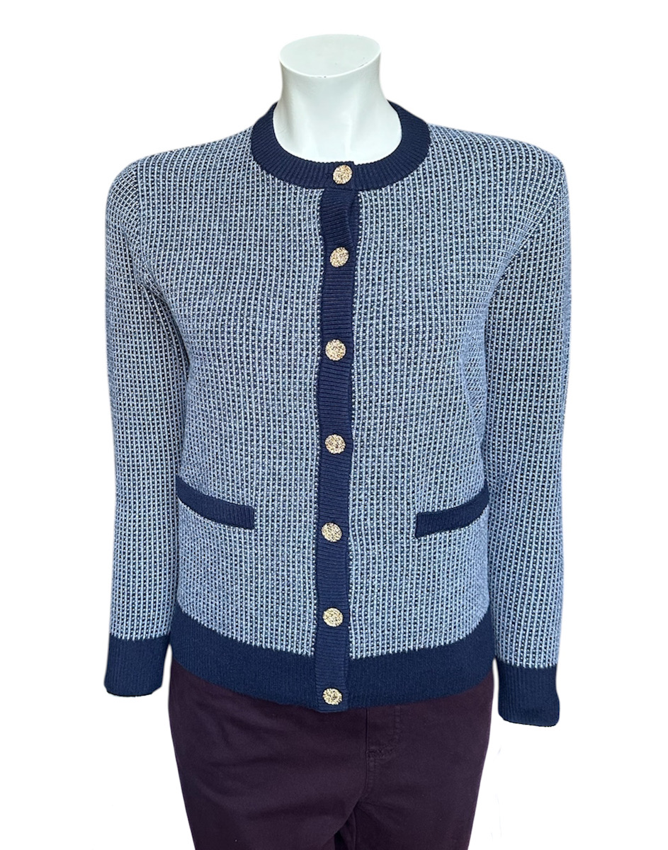 A round neck long sleeve print Button Up Cardigan from Castle of Ireland with front facing pockets and mother of pearl buttons.