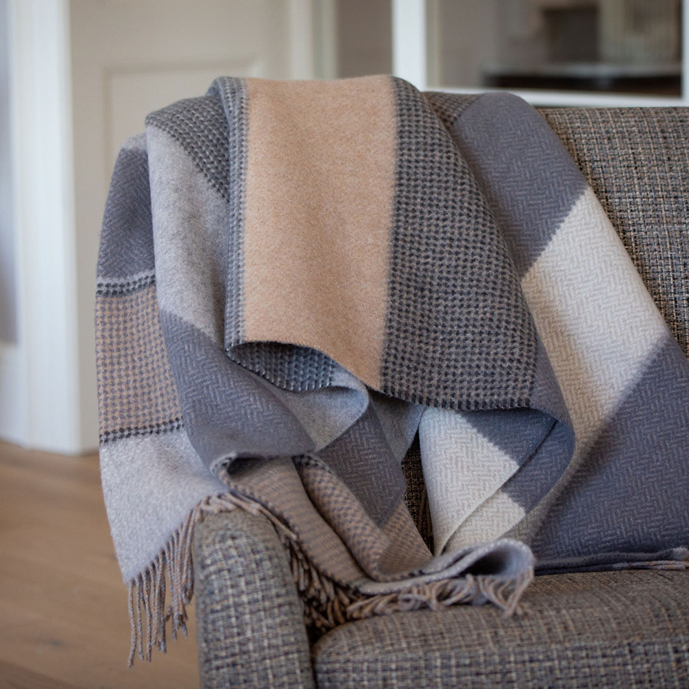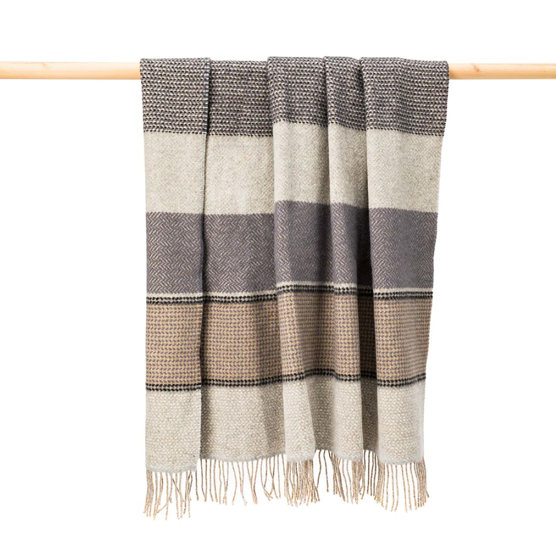 These Throws are made from 95% Merino wool enriched with 5% finest Cashmere, giving them the warm luxurious silky feel of cashmere. Â This one comes in Grey Stone Beige Stripe pattern.