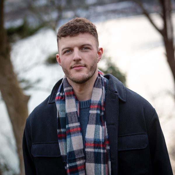 Fine lightweight merino wool scarf in a Navy Red Biscuit Check pattern